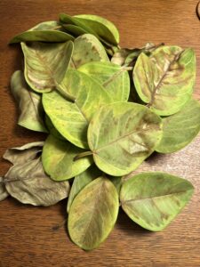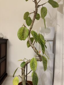 1ヶ月前に購入したばかりのフィカス・アルテシマの葉が全体的に下向きになって、黄色く変色して落葉してます。室内で管理して水やりも控えてますが、対策を教えて下さい。