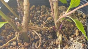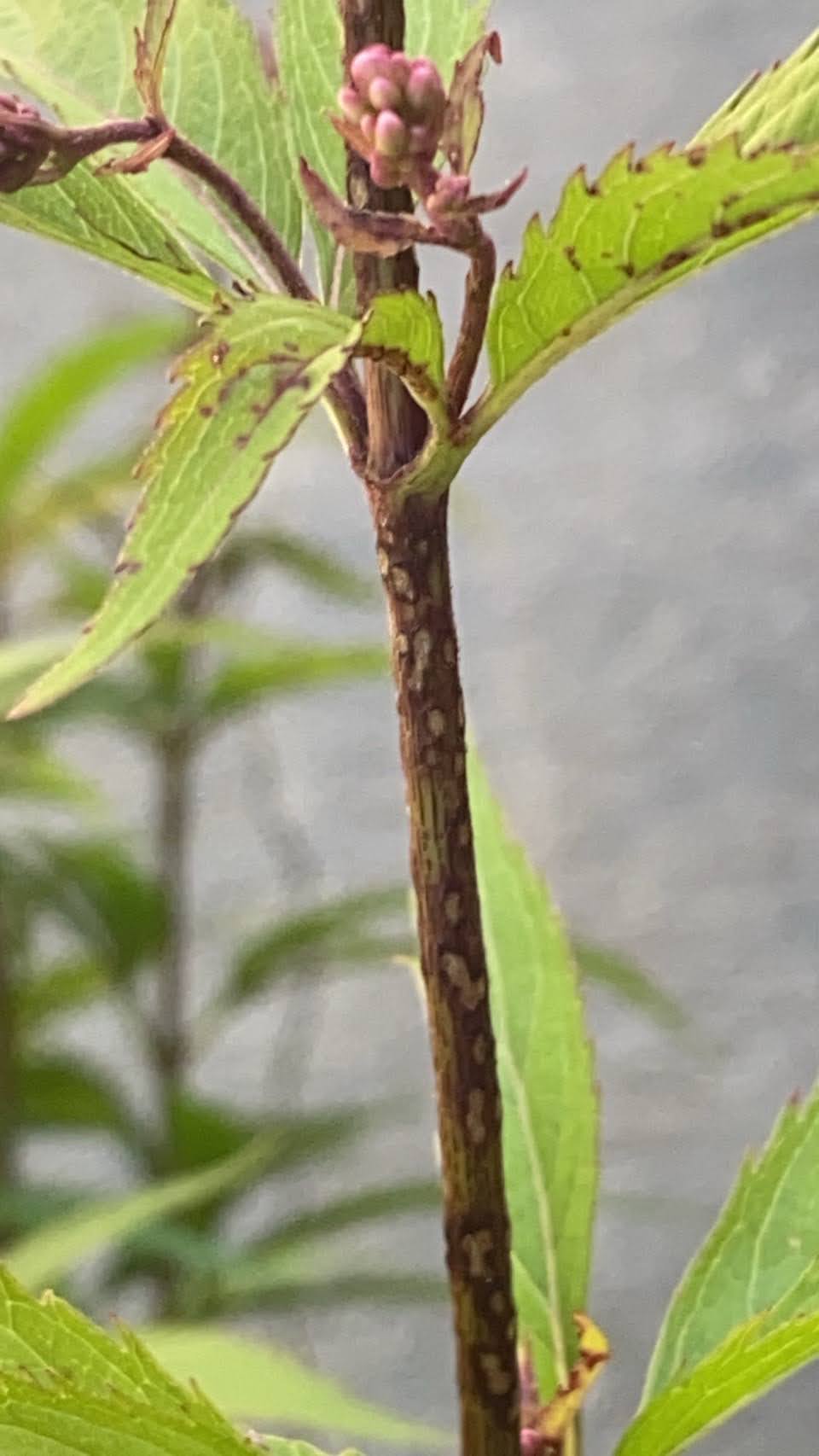フジバカマの茎に斑点がありますが、対処法を教えて下さい。 廃棄すべきか、消毒で済むのか知りたいです。根は健全のように見えます。