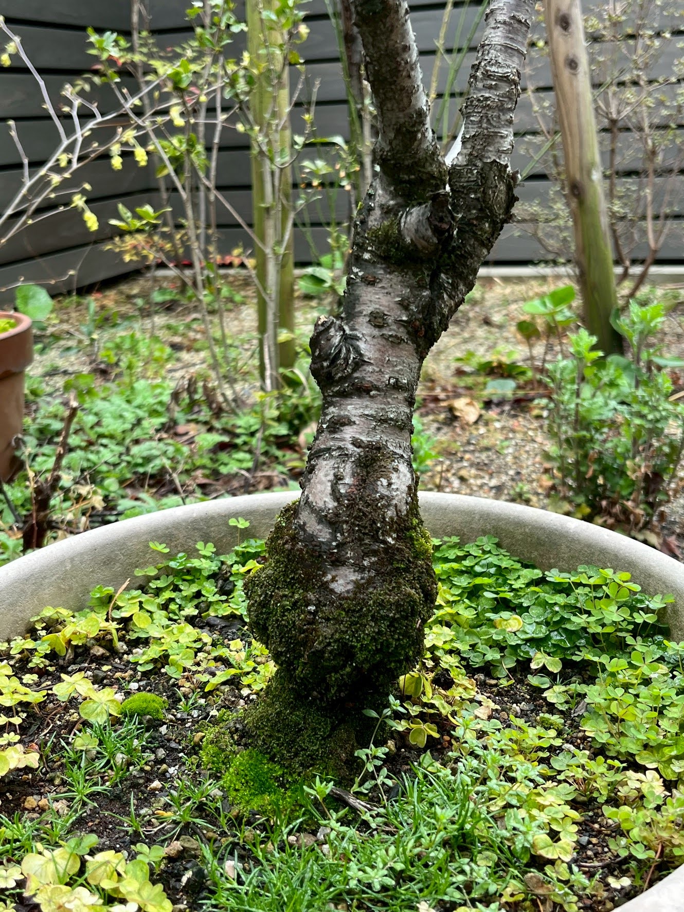 鉢植えのサクラの元気がありません、樹齢は40年以上で樹高1mくらいです。                                                    根元が細く、その上が膨らんだようになっていて、幹の皮が数カ所めくれたようになっています。この時期に花芽が一つしかないです。全体的に弱っているようです。