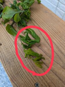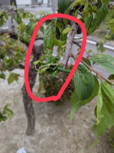 高さが2.5m程の枝垂れ梅の葉が丸く縮んでいます。                                    どの様な手当をしたら良いですか?